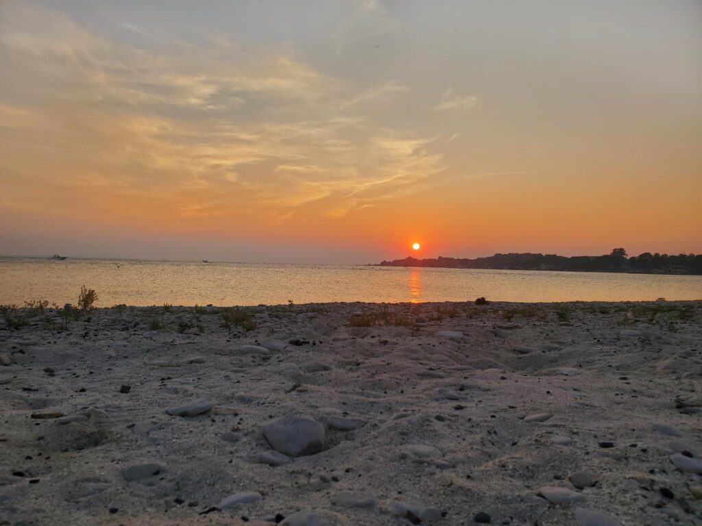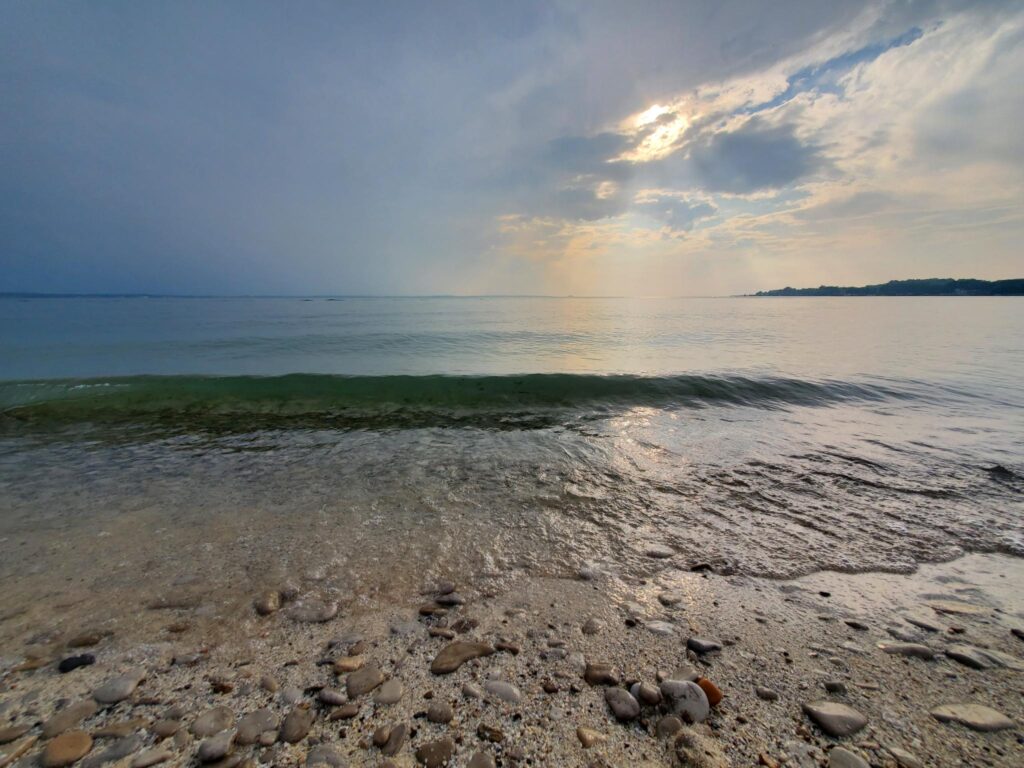 This is what an evening at the beach looks like when the wind is relatively calm and there are only a few rolling waves from the boats going back and forth.