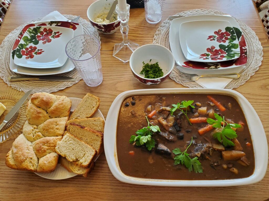 Pot roast and homemade bread with herbed butter. We grew fresh parsley, basil, etc., in a little herb garden on the back porch, which was great for spice options and garnishes all Summer.
