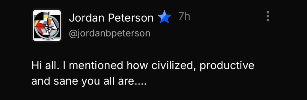 The stuff Peterson says about all of us in the podcast with Sam Harris is part of a larger conversation he’s having about the ills of free access to social media where he talks of online anonymity as a possible cause for the sorts of behaviors he’s just ascribed to us.