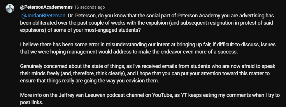 16 June 2025 Comments Removed from Jordan Peterson’s YouTube Video with Sam Harris