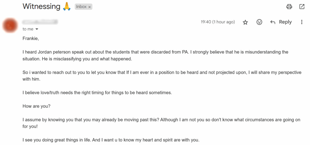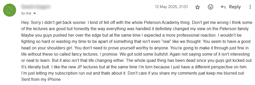 17 June 2025 Email from Peterson Academy Student Expressing Support in the Face of Peterson’s Mischaracterizing Us on His Podcast