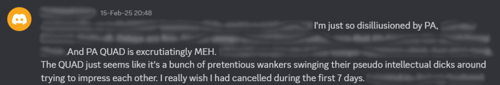 Let’s briefly talk about a big mistake I made. My last post on the Academy’s social feed was a criticism directed at the leadership and their behavior. At the end of this criticism, I wrote that I had no intention of leaving the Academy. One or two weeks later, however, [“Dragon” student] was banned, and I’d had enough. I emailed the Academy a criticism and added at the end that I wanted a refund. However, I also wrote that if they would offer me the refund that they wait a day, so that I could post a final friendly/sympathetic message on the social feed, stating that I was leaving voluntarily and wishing the others the best despite our differences. This request was not granted, but I did receive a refund. I was still on discord at the time. I should have left a message there. However, there was a certain [student] there who insulted many [other] students and constantly devalued my criticism by implying that I was friends with you, Dusty, [“Dragon” student], and the rest. However, I never interacted with you. So, in a fit of rage, I quit the server and left no message. When I tried to leave a message for clarification 3-4 days later (because i want to be honest), I couldn’t find the server anymore. Clearly, I’m at fault, and this behavior may have misrepresented my situation to students who were wondering where I was. I wasn’t banned, but I certainly would have been if I hadn’t left voluntarily. I’m glad you wrote to me; this allowed me to clarify and present my perspective correctly, and I hope I was able to be of use to you in your endeavor.