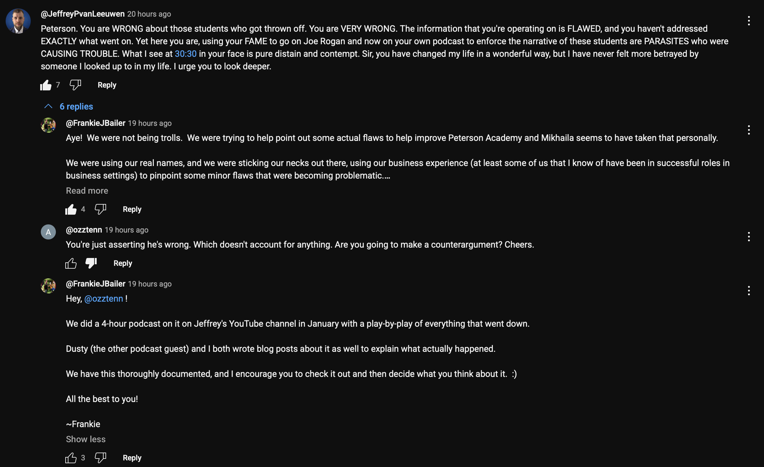 These concerns were also reflected in the feed. An academy using the name Peterson could have decided, after all the questions from students in the feed, to communicate the future transparently. However, despite numerous questions, NOTHING happened. This led to frustration for many. Dusty, [“Dragon” student], you and others raised questions about it every day. Perhaps you exaggerated a bit, it could be, but for me, these questions were more than justified. Another point for me was that I didn’t see any disrespectful/insulting posts towards the leadership. So, everything was fine. Then Mikhaila even took a disrespectful swipe at you in one of her posts (I unfortunately don’t remember the content exactly, but I think she was confirming another student’s theory that you’re narcissists or something like that). That really called this woman’s integrity into question for me. Then you were banned, which I think was unjustified, because your questions were justified and not disrespectful. After all the missing features, bugs, etc. mentioned, they more than owed us an answer. Then questions about your bans were asked daily, politely but not disrespectfully. As a result, the active critic posters (daily or every two days) were also banned. [“Dragon” student] and I then posted about the bans every three or four days, politely and not disrespectfully. [“Dragon” student] phrased his questions so beautifully and cleverly that just reading them was enriching, given how well the man could express himself. But we never received any answers.I have a very high moral compass that strikes an extreme when I perceive things as unfair. However, for me, all the bans were unfair compared to the bans of Brian and co. The leadership avoided dealing with criticism constructively, something that, according to Jordan Peterson’s teachings, shouldn’t happen (stand up straight with your shoulders back). However, I increasingly realized that this wasn’t Jordan’s academy, but his daughter’s. His name was simply being used for marketing purposes; I can’t explain this behavior any other way. So, I reached a point where I had little/no fun being part of the academy anymore, as I felt that “free speech” only existed here if it wasn’t (justifiably) directed against the leadership. Nevertheless, I still tried to believe in the vision. On a positive note, after a certain period of time, the academy published a future plan that addressed all the criticism and clarified what the future would look like regarding accreditation, the app, etc. That would have been a good time to bring back the banned people. But they didn`t bring back the unjustified banned people and when [“Dragon” student] was banned, I’d had enough. I decided to leave the Academy, as I would have been next on the list anyway.